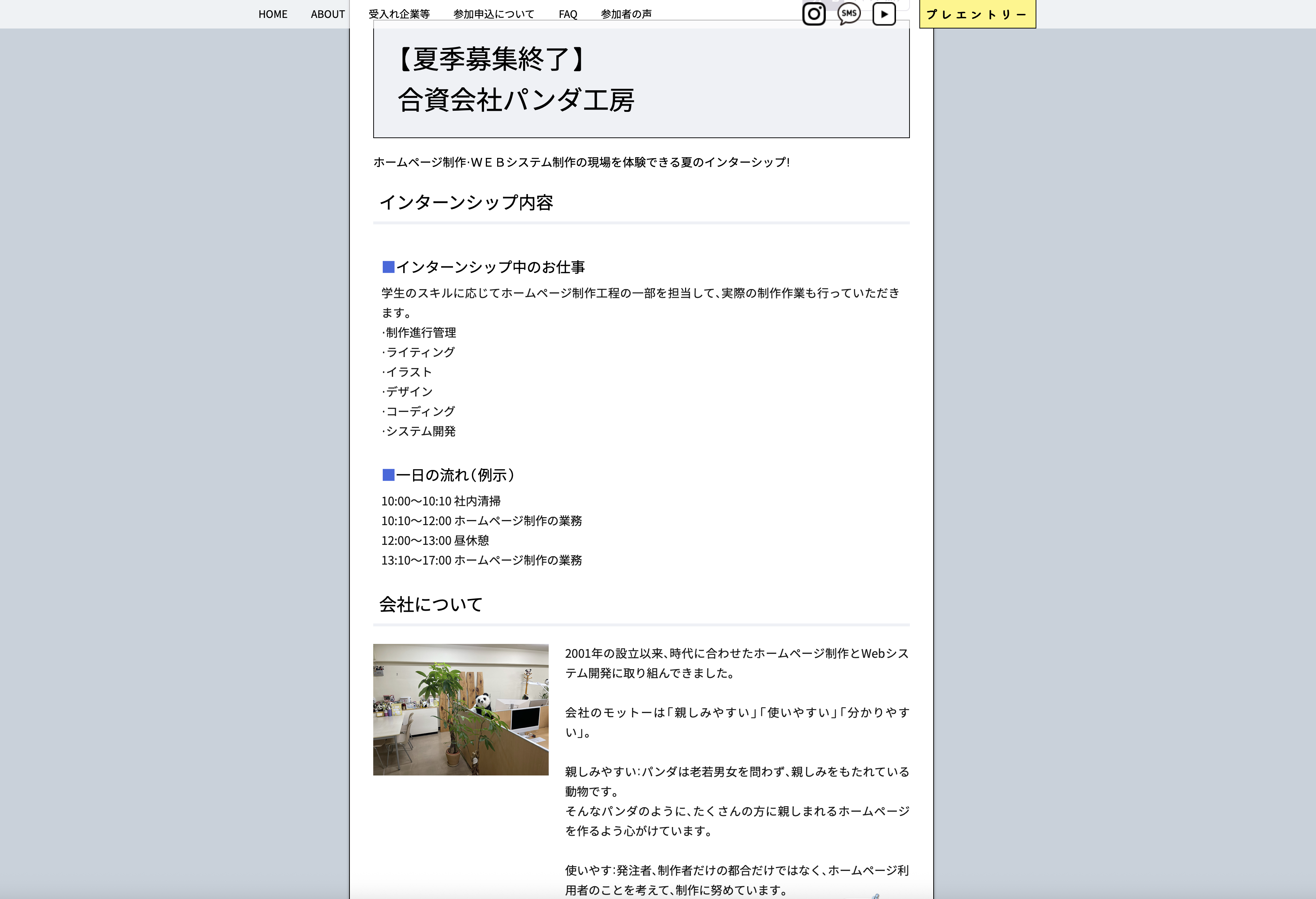 パンダ工房では「ホームページ制作・WEBシステム制作の現場を体験できる夏のインターンシップ!」として、以下3名の学生を受け入れました。
